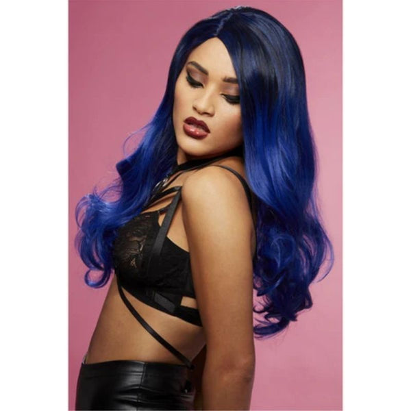 Transform your appearance with this gorgeous Manic Panic After Midnight Ombre Queen Bitch Wig with long drop curls with side parting. Long and luscious going from black and dark blue to lighter shade of blue. This light weight wig has been designed to look and feel like your own hair, it is heat style-able.