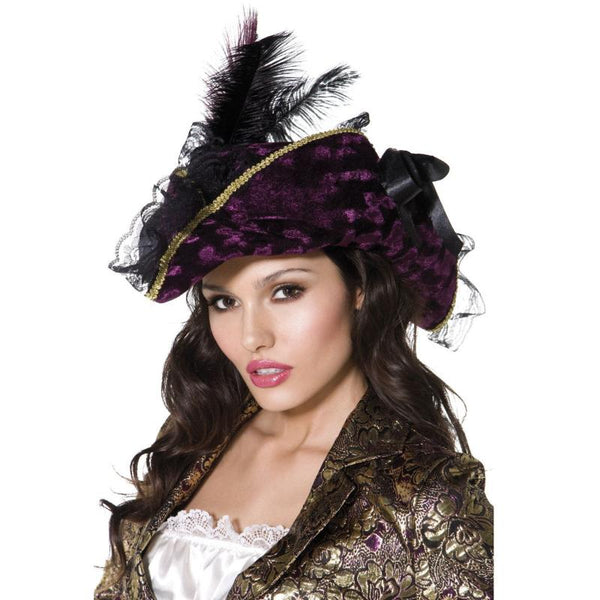 Be the most terrifying yet fashion-forward pirate on the high seas with this luxurious Marauding Private Hat!! This purple velvet hat is edge with black lace, perfectly contrasting with the golden cord around the edges is sure to give you the regal look of a pirate captain and have your onlookers...