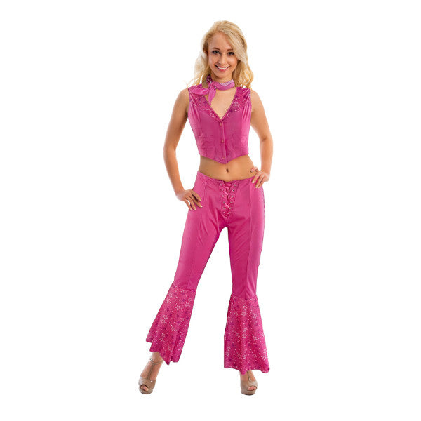 Lookin' for sumpin' sweet to don for your next hoedown? Look no further than our Pink Western Adult Costume! Not for the faint of heart, this getup consists of a pair of pants with a flare of complementary pink star print fabric, and a vest with star print insert. It's rounded out with a matching bandana perfect for getting your honky tonk on. Yeehaw!!