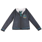 - Printed detail includes cardigan with cuff details and buttons, shirt, tie and house emblem