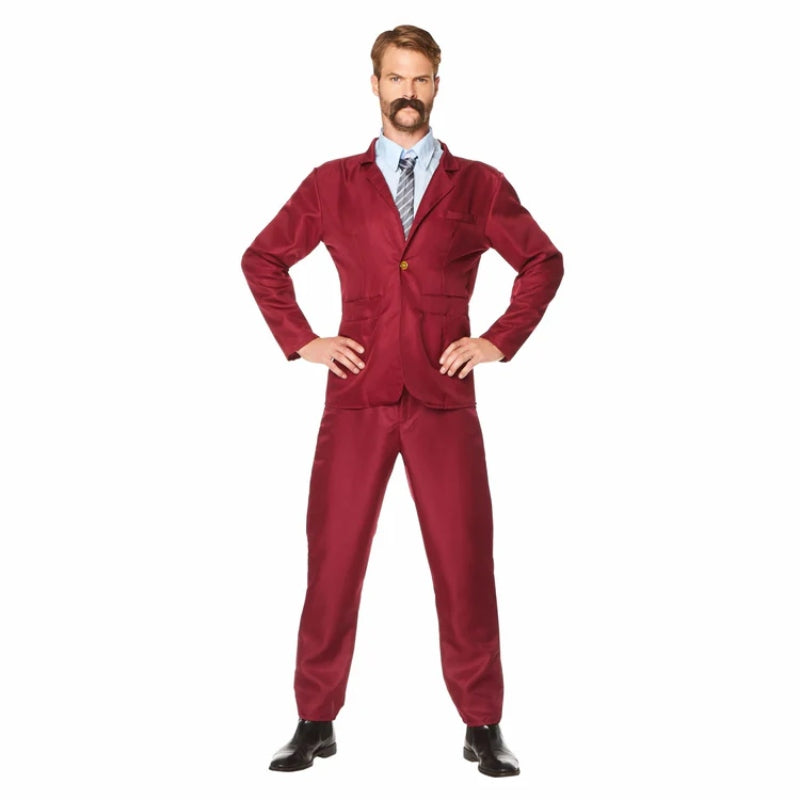 Step back into the 70s with our Burgundy Newsreader Suit! This retro outfit comes with a jacket and shirt insert, trousers, and a tie, creating a classic throwback look. The set also includes a brown wig and moustache for a fun finishing touch. Perfect for retro parties, group costumes, or themed events, this outfit combines style and humour with vintage charm.