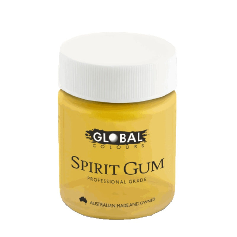 Global Spirit Gum Adhesive is a is a yellow coloured cosmetic adhesive (glue) for attaching costume prosthetics such as moustaches, wigs, beards, gems as well as special effects prosthetics. This product is made by Global Colours.