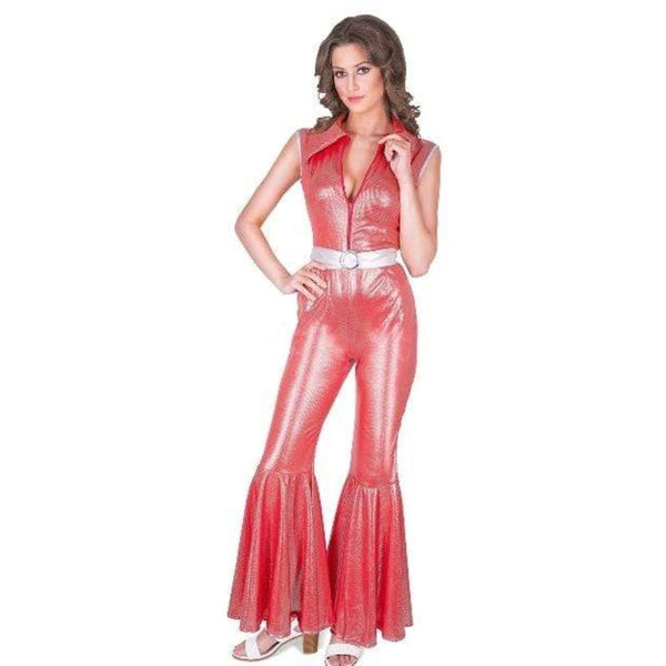 Get groovy and go back in time with our Red/Silver Disco Diva Jumpsuit Costume! Show off your dance moves with the lightweight shimmer fabric that's perfect for the dance floor. Relive the disco era with style and sass.