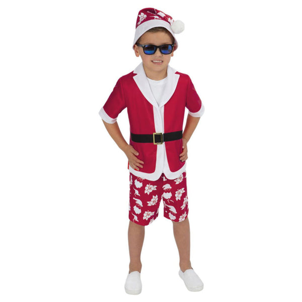 This cute outfit features a Short Suit Jacket, summer Santa print shorts and a matching hat. Australian Christmas Boys Short Suit Costume is perfect to dress him up for a memorable family BBQ!