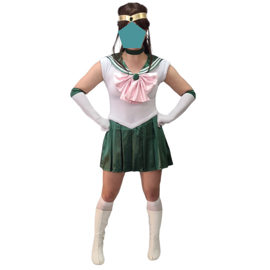 Please call ahead on 07 3870 5881 to confirm availability. "Fighting Evil by Daylight, winning love by Daylight" Ladies Planet Jupiter Soldier costume is inspired by the 1990's Anime series.  Ladies Planet Jupiter Soldier Hire includes: Dress with back and front bow Gloves Choker Headpiece/Soft Tiara White gogo boots Available in Medium...