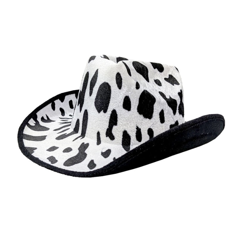 Experience the rugged charm of the American West with our authentic cowboy hat made from cowskin print. This classic hat features a wide brim and a comfortable fit, perfect for completing your cowboy or cowgirl look.