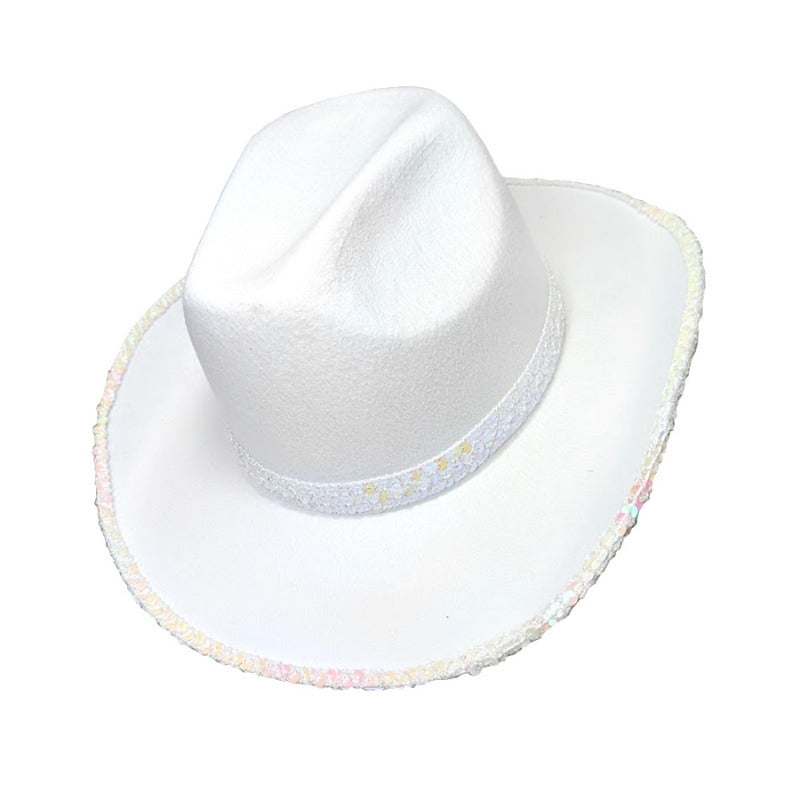 Looking for a unique accessory to complete your festival outfit? Look no further than our White Festival Hat with Sequin Trim! Perfect for cowboys and cowgirls alike, this hat adds a touch of western flair to any look. Stand out from the crowd and shine with its stunning sequin trim.