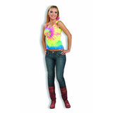 Hippie Tie Dye Tank Top Ladies will complete your 70's costume, just add some fantastic flares. The tank top is rainbow colors with a fine rib texture.