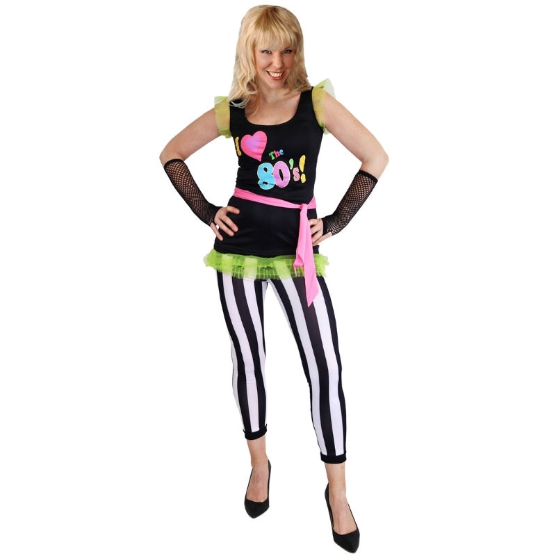 Channel your inner rockstar with this bold and sassy 80's Women's Rocker Costume! Featuring an “I Love the 80s” slogan on a sleeveless long top, paired with black and white striped leggings and a waist tie, this outfit screams retro attitude.