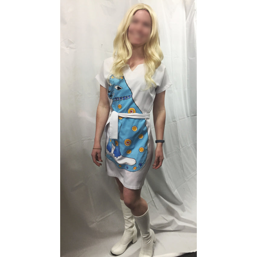 This 1970's Musician's Cat Outfit - Hire includes a dress, sash, and white go-go boots; perfect for any party or event. Channel your inner singing sensation and unleash your wild side with this funky, nostalgic ensemble. Meow!