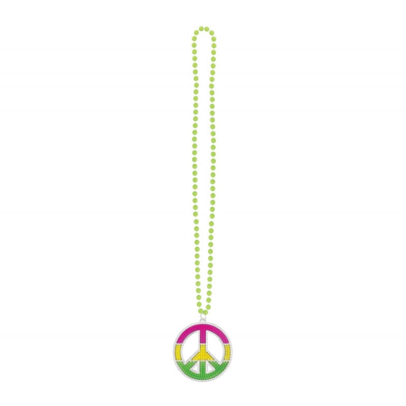 Large Peace Sign Necklace has green beaded necklace with pink, yellow and green detail peace sign against a silver edge.
