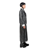 - Jacket in pin-striped black and grey tones with Nevermore Academy crest printed on left chest and three buttons, plus attached white cuffs