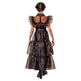 - Long black dress with puffed tulle shoulders and frills embellishing the whole dress.