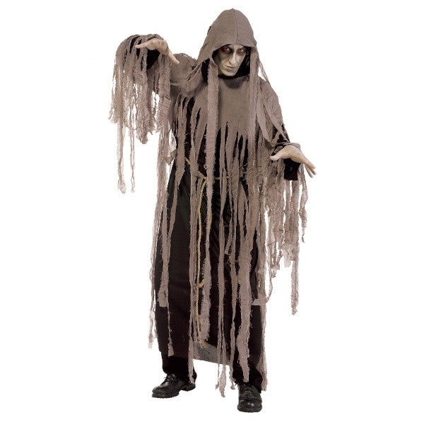 - Full length black hooded gauze robe with attached fabric pieces on arms, hood and collar