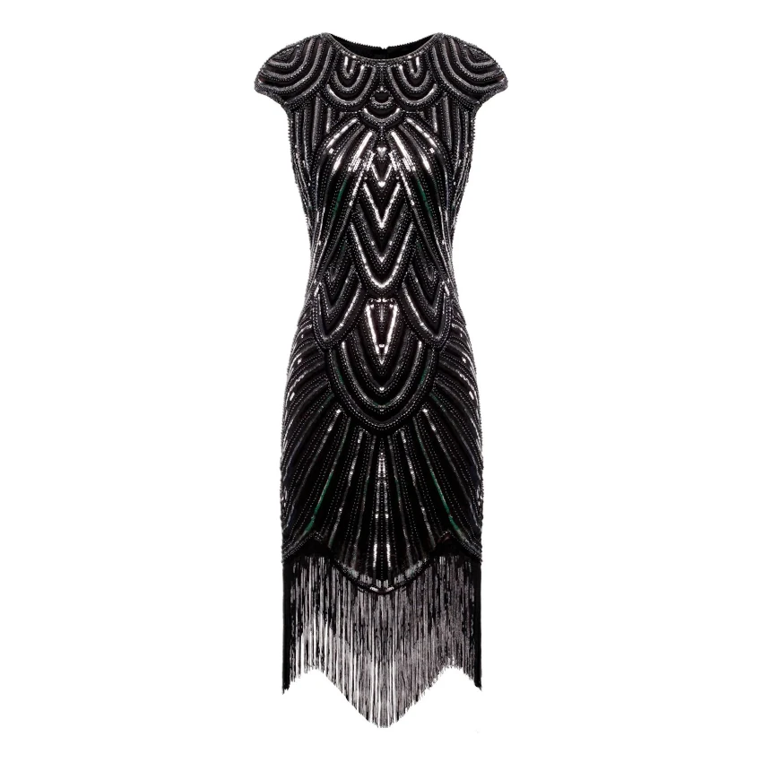 This stunning 1920s style Fringe Flapper Dress is a gorgeous deco affair in black. Thanks to swirling sequin patterns, it sparkles and shines all night long. Plus, the sultry boat neck and cap sleeves make it even more alluring.
