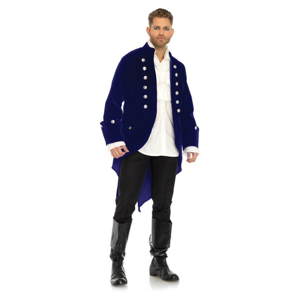 The costume possibilities are endless with this Long Velvet Coat for men. The luxe blue velvet coat features coin buttons along the front and cuffs of the jacket. The royal coat-tail cut makes this a perfect option as a pirate coat, handsome beast costume, historical costume, and so many more!