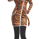 - Hooded velour fitted dress with fingerless glove 'paws' and front zip. Dress is in traditional orange and black striped pattern.