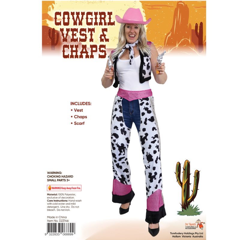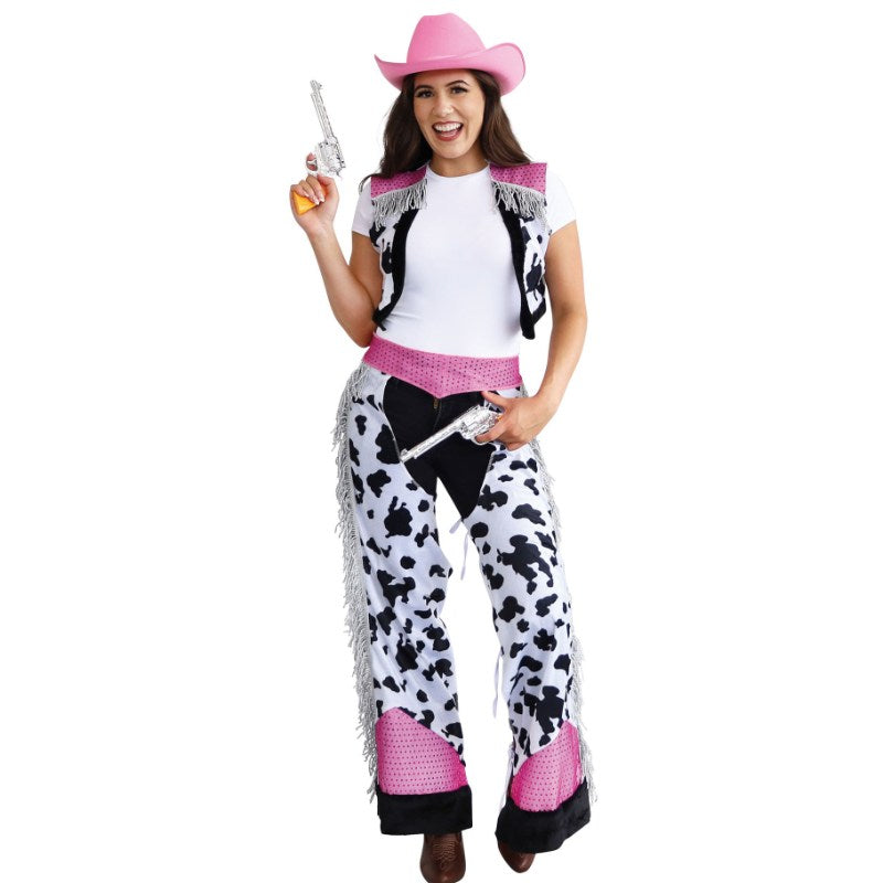 Yeehaw! Kick up your boots in the Cowgirl Vest & Chaps Costume, a wild west-inspired outfit that's all sass and style. This set features black-and-white cow print chaps with a bold pink trim and lace-up sides for a secure, adjustable fit. Paired with a matching vest and neck tie, you'll be ready to round up compliments all night long.