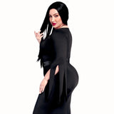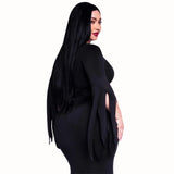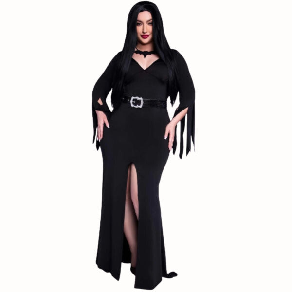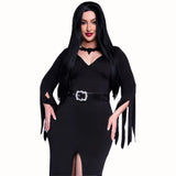 Enslave them, body and soul with the iconic Plus Immortal Mistress Halloween costume by Leg Avenue. Sultry, elegant, and absolutely irresistible, this sexy Halloween costume is sure to take their breath away (literally). The 3 PC costume includes a deep-V body hugging dress with classic tentacle hem and tattered sleeves, sequin belt, and a spooky glitter bat necklace. Pair with your favourite heels and let your inner Morticia shine!