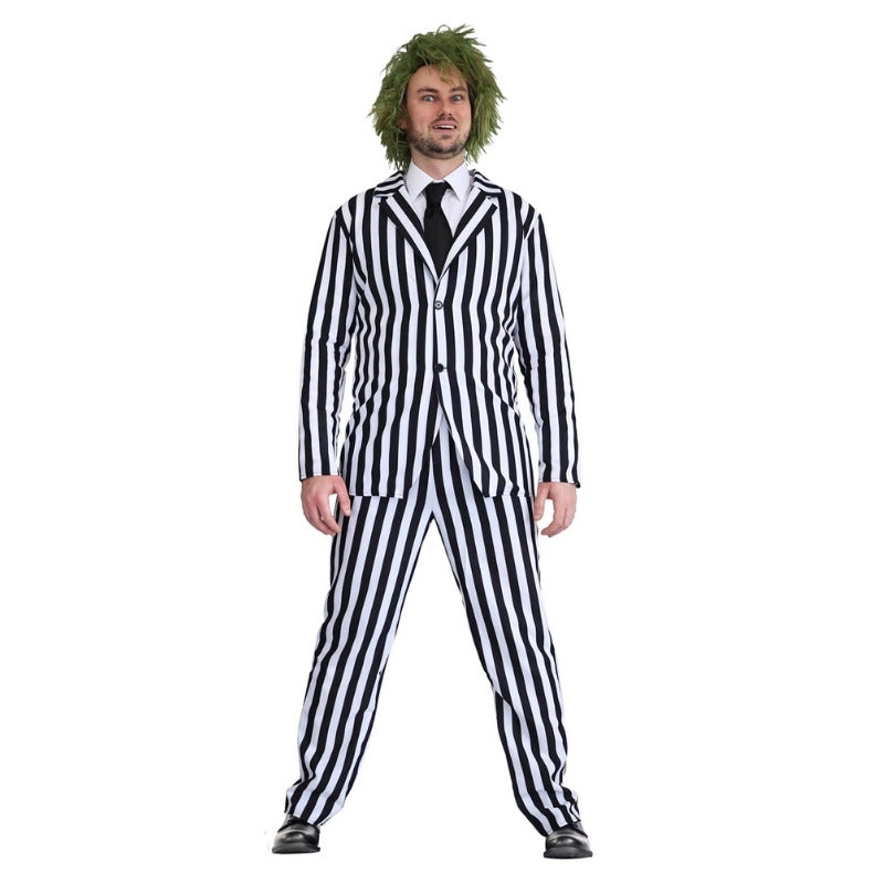 It’s showtime! Step into the weird and wacky world of the undead with the Beetle Time Black & White Stripe Men’s Costume, inspired by a mischievous movie ghost we all know. With its bold vertical stripes, this standout costume is perfect for Halloween parties, movie-themed events, or spooky cosplay.