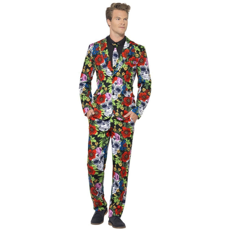 Step up your style game with our Day of the Dead Stand Out Suit! Perfect for Cinco De Mayo Mexican festivals, Halloween or the races, this multi-coloured suit features a floral and skull design, comes complete with a lined jacket, zipper pants with pockets, and a matching tie. Be the centre of attention with this quirky and unique outfit.