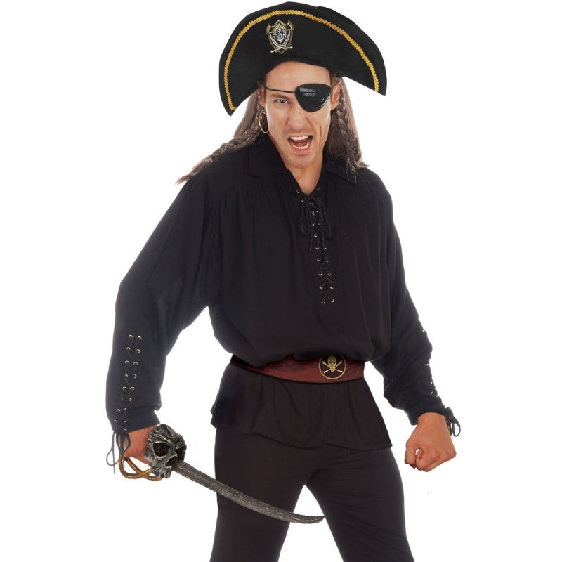Sail the high seas or roam medieval lands in style with the Black Medieval Pirate Shirt from Dr Toms. This versatile costume piece features a flowing design, lace-up neckline, and cuff detailing—perfect for creating a range of characters from swashbuckling pirates to brooding gothic nobles.