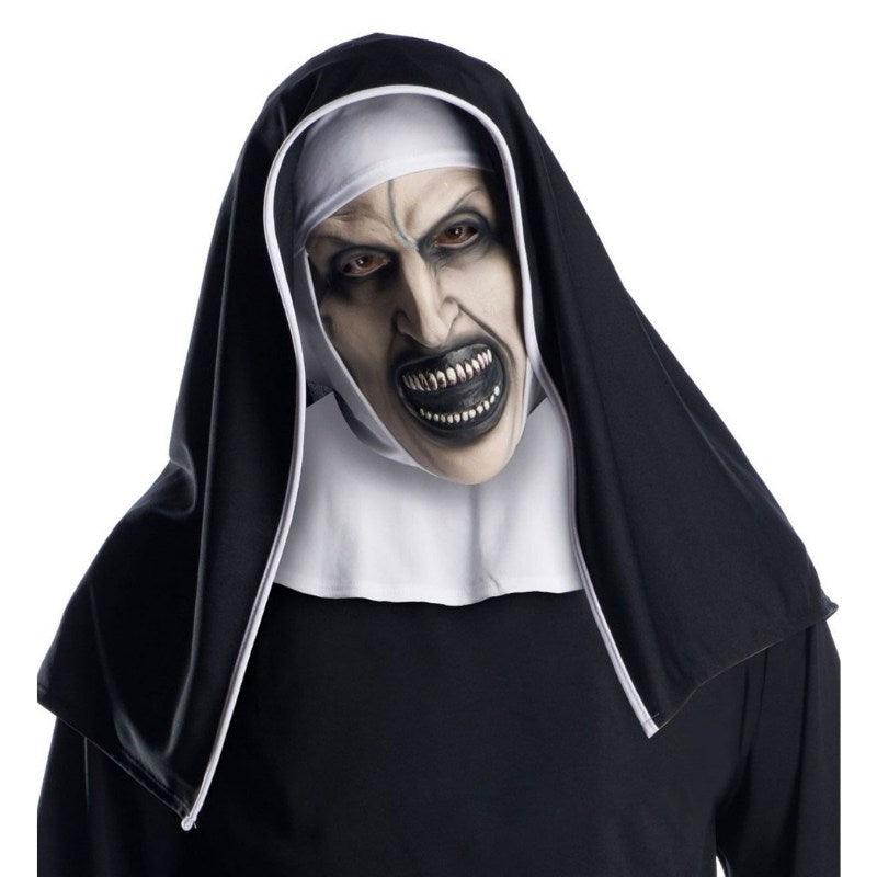 This mask features the haunting face of The Nun character, complete with painted details and an attached black headpiece with white trim. Perfect for Halloween parties, horror events, haunted houses or spooky dress-up occasions.