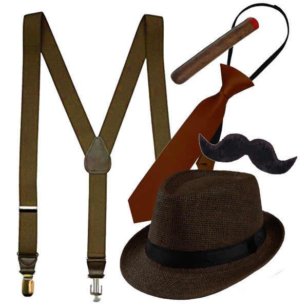 Experience the old-school charm of the roaring 20s with this Gatsby Male Kit! It's the perfect getup for any costume party, with a brown hat, suspenders, tie, cigar, and an adhesive moustache for a classic look that never goes out of style. So slip into the kit and party like it's 1922!