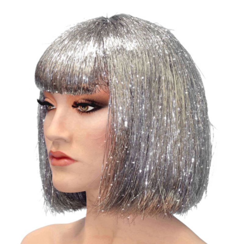 Shine like a star at your next party with our Silver Disco Bob Wig! Featuring lots of thin tinsel in a classic bob cut, this funky wig is perfect for turning heads at 70s disco nights, space-themed events, or any party that calls for sparkle. Light and comfortable to wear, it's a fun and easy way to complete your groovy outfit.