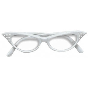 Add a touch of retro glamour with these 50s Rhinestone Glasses – White. Featuring the classic 1950s cat-eye shape with sparkling rhinestones and clear lenses, these vintage-inspired glasses are perfect for Rock ‘n’ Roll, Retro Diner, or Book Week costumes.