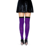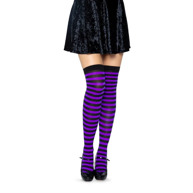 Add a dash of Halloween magic to your costume with the Black & Purple Stripe Thigh Highs by Leg Avenue. These over-the-knee striped stockings are soft, stretchy, and made for standout spooky style. Whether you’re dressing as a witch, trick-or-treating, or heading to a themed event, they’re the perfect playful touch.