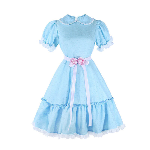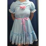 Hire includes: Blue dress with collar & pink ribbon belt.