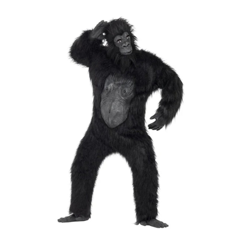 Transform into the king of the jungle with this Deluxe Gorilla Adult Costume! This high-quality outfit features a furry bodysuit, detailed rubber chest, realistic latex mask, and matching hands and feet for a complete gorilla transformation. Perfect for Halloween, themed parties, or performances, this costume guarantees laughs, scares, and unforgettable photo moments.