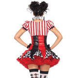 With delightful details and flirty styling, you'll be a total big top babe in the 3 PC. Harlequin Clown costume by Leg Avenue. This sexy women's costume includes a ruffle trimmed suspender dress with pom pom accents, ruffle neck piece, and matching pom pom clown hat.