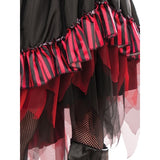 - Dress with fitted bodice and layered skirt featuring red and white edging and tulle underlay.