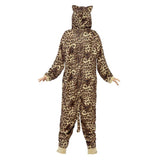 - Leopard print jumpsuit, zips up at front, attached hood with cute face and attached tail.
