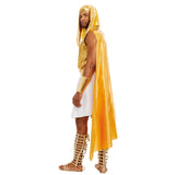 Men's Ramses Egyptian Costume is a metallic gold sleeveless shirt, Egyptian collar with attached gold cape, wrist gauntlets, Royal Nemes headpiece, and Egyptian Shendyt skirt with embellished waistband.