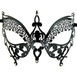 Black Butterfly metal masquerade mask, is studded with diamantes and ties with ribbon at the back.