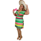 Mexican dress in lightweight polyester fabric with red pom pom trim on the bodice and sleeves.
