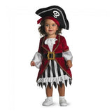 This adorable costume is a black and white striped skirt with attached red velvety jacket with gold detail. Complete with skull pirate hat.
