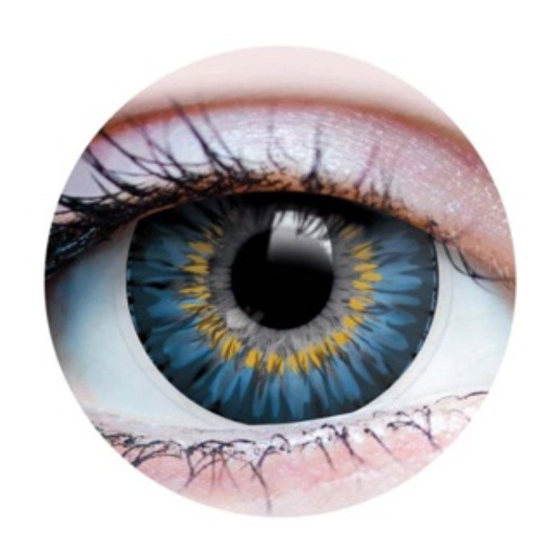 Transform your look with Primal Contact Lenses! Perfect for Halloween, Walking Dead cosplay, or any occasion. The Moonrise-Ocean/Natural design features a unique blend of blue, grey, and a hint of yellow. Embrace your wild side and stand out with these fun and playful lenses.