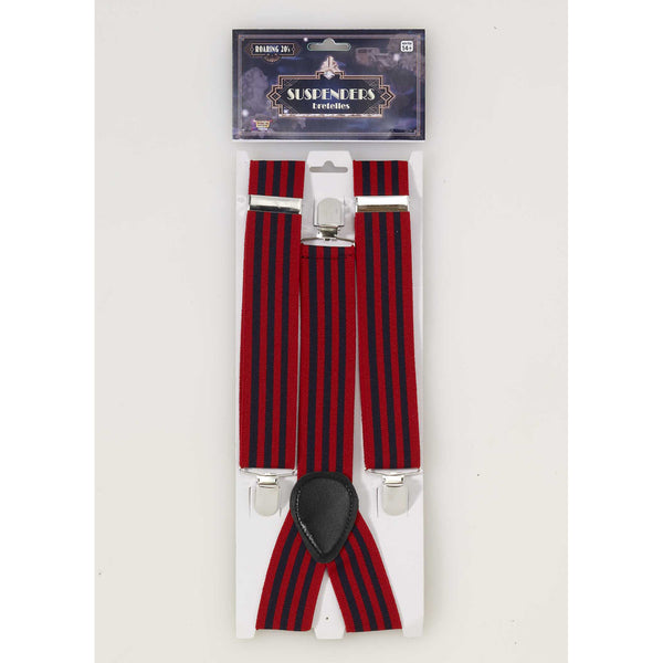 These stretchy red and blue stripe braces/suspenders are a great accessory for Gangster, 1920's, Geek, Circus and many other costumes.