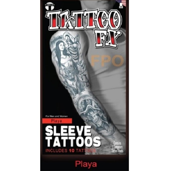 Unleash your inner rebel with Sleeve Tattoo - Playa by Tinsley FX! Transform into a badass with 3 large, versatile temporary tattoos featuring a lady, clown face, bull dog, flames, and skull. Perfect for covering 1 arm, this tattoo set will give you the edgy look you've always wanted.