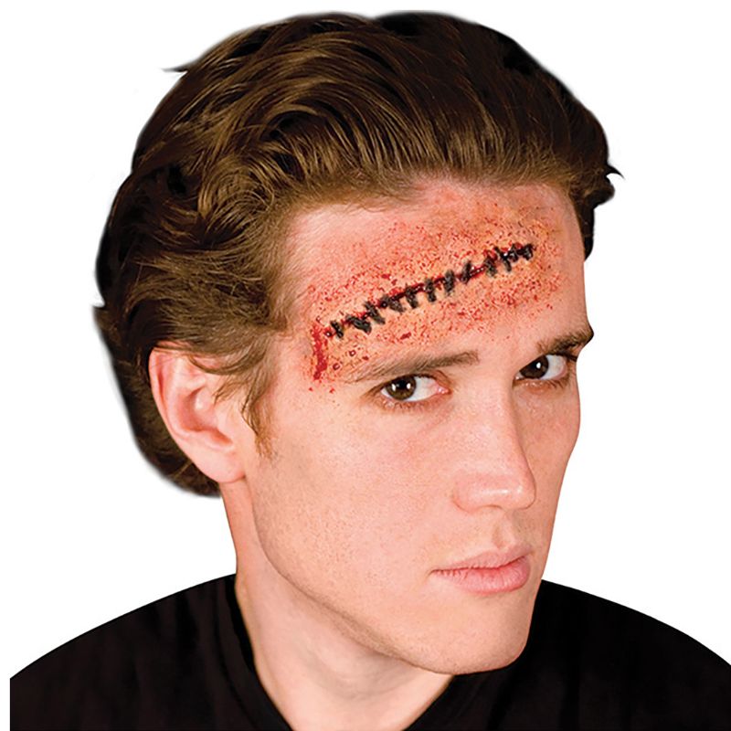 Transform your look into a terrifying monster with Stitches - 3D Prosthetic by Woochie! This realistic and gruesome prosthetic features detailed stitches, perfect for creating a zombie or other horror-themed character.