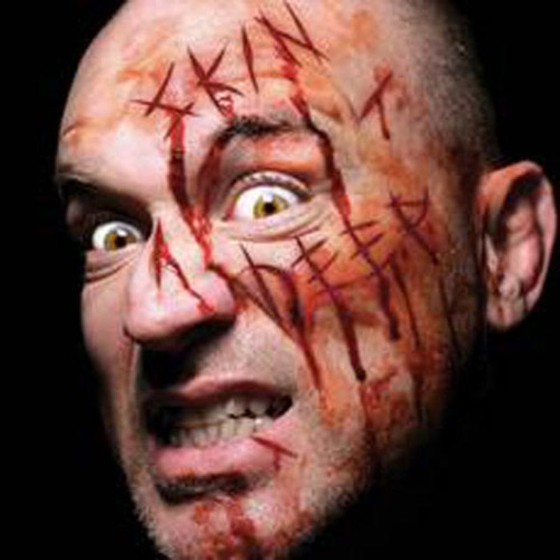 Transform your look with the Tinsley FX Temp Tattoo - Human Carving Board. This unique design features "skin deep" cuts, perfect for Halloween or adding some edge to your style. No pain, just killer style!