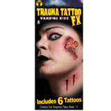 Transform into a sultry vampire with Tinsley FX Temp Tattoo - Vampires Kiss! Featuring realistic vampire teeth marks and a gothic cross, this temporary tattoo is the perfect accessory for Halloween (or any time you want to channel your inner bloodsucker!). No biting required. (Sorry, Twilight fans.) Description:  Trauma -...