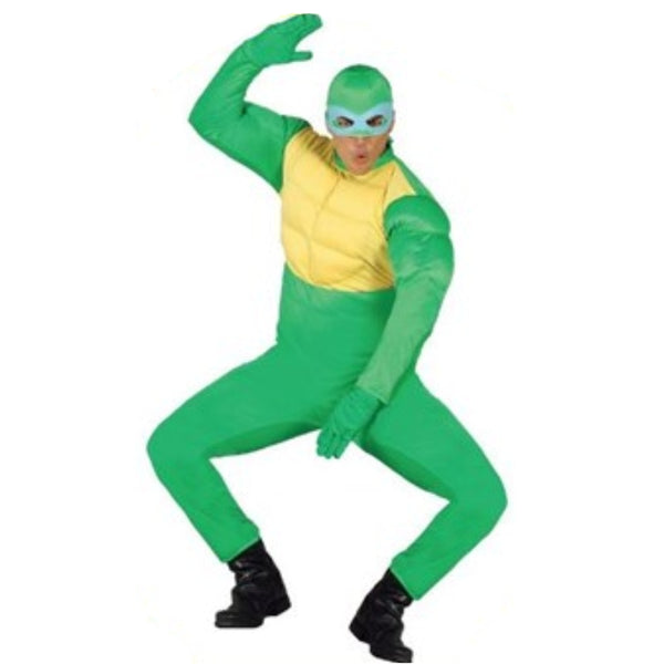 Transform into a totally tubular turtle with this adult costume! The green jumpsuit rocks a padded yellow chest, while the green hood comes with a bodacious blue mask. Grab your pals and shell-ebrate in style. Cowabunga!